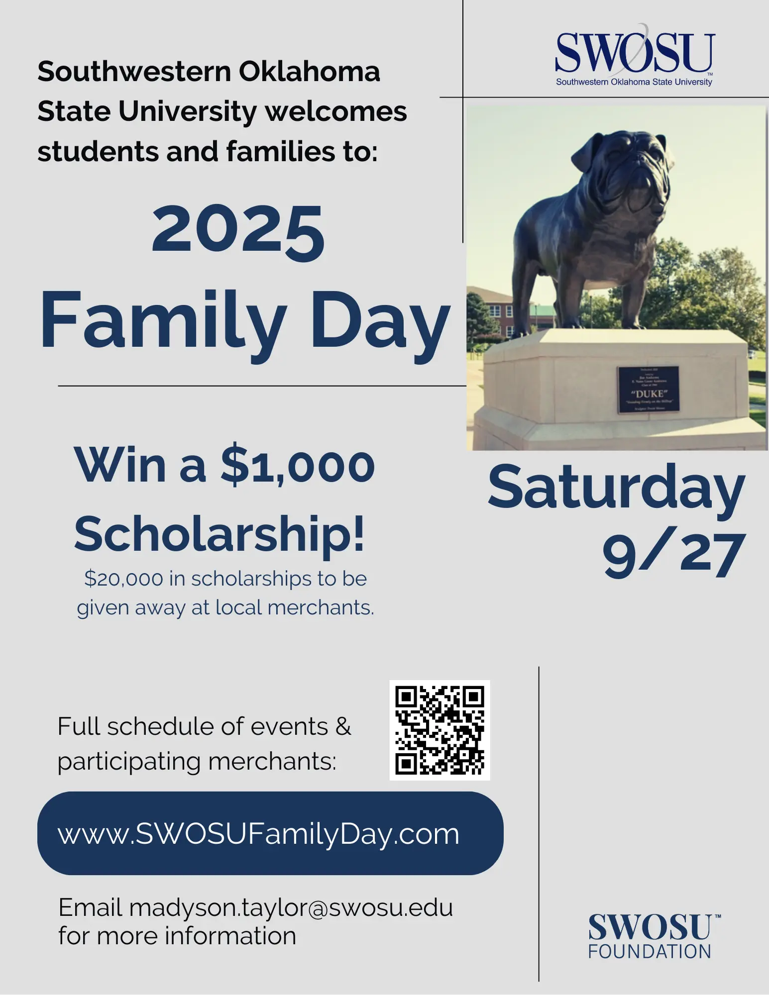 Southwestern Oklahoma State University (SWOSU) will host its 2025 Family Day activities on September 27. Students are invited to bring their parents and family members